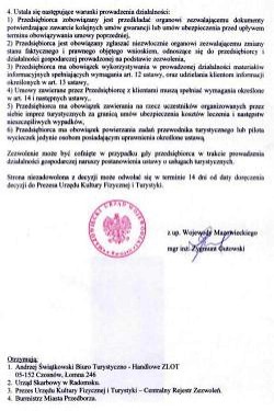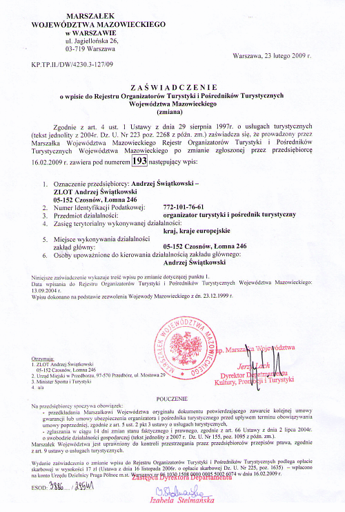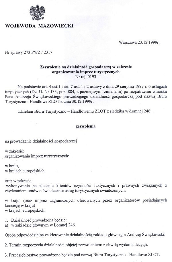 1. Zezwolenie na prowadzenie działalności gospodarczej w zakresie organizacji imprez turystycznych wydane przez Wojewodę Mazowieckiego nr 0193.